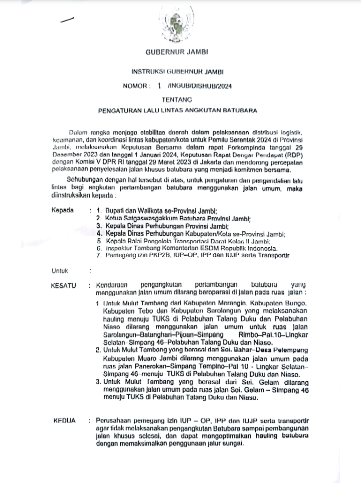 Saat ini kalau menurut pandangan kami, (igub) yang dikeluarkan oleh gubernur Jambi Al Haris tidak berlaku. Seolah-olah intrusi gubernur (igug) itu tidak dihargai oleh pihak perusahaan tambang batubara yang beroperasi melintas di jalan nasional.