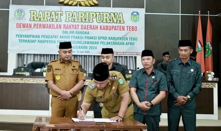 Deteksijambi.com ~ TEBO – Senin, 16 Juni 2025, menjadi hari penting bagi Kabupaten Tebo. Bupati Agus Rubiyanto dan Wakil Bupati Nazar Efendi menghadiri rapat paripurna DPRD Kabupaten Tebo untuk mendengarkan pendapat akhir fraksi-fraksi terkait Rancangan Peraturan Daerah (Ranperda) Pertanggungjawaban Pelaksanaan Anggaran Pendapatan dan Belanja Daerah (APBD) Tahun Anggaran 2024.