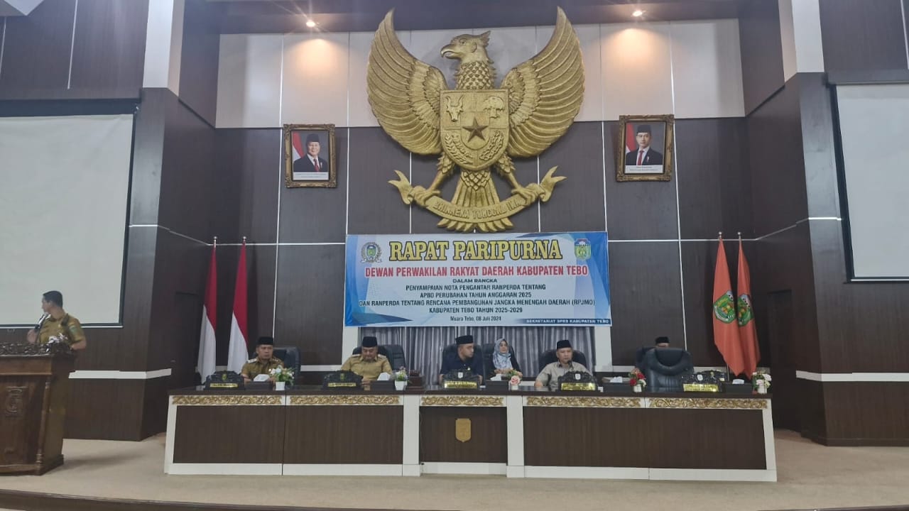 Deteksijambi.com ~ TEBO – Rapat Paripurna DPRD Dalam Rangka Penyampaian Nota Pengantar Ranperda Tentang Perubahan APBD Tahun Anggaran 2025 dan Ranperda tentang Rencana Pembangunan Jangka Menengah Daerah (RPJMD) Kabupaten Tebo Tahun 2025-2029 Selasa (08/07/2025), di gedung aula utama DPRD Kabupaten Tebo Jambi.