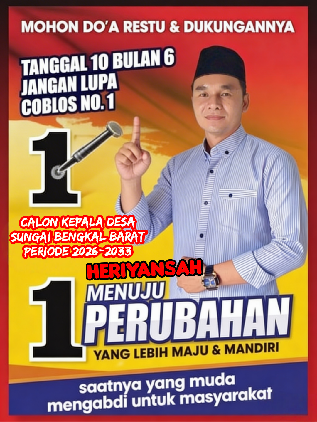 Nomor satu bukan sekadar angka, melainkan simbol kepercayaan, kesungguhan, dan komitmen untuk menjadi yang terdepan dalam melayani. Semoga keberuntungan dan ridho Allah SWT selalu menyertai, sehingga nomor urut ini menjadi awal dari kemenangan yang hakiki, dan Heriyansah terpilih menjadi pemimpin yang amanah untuk Desa Sungai Bengkal Barat.