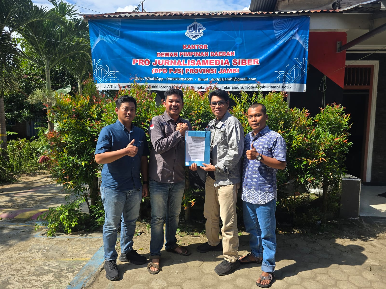 Ketum DPP PJS Mahmud Marhaba saat mengabadikan penyerahan SK DPD PJS kepada Pengurus DPD PJS Jambi, Jumat (18/04/2025).