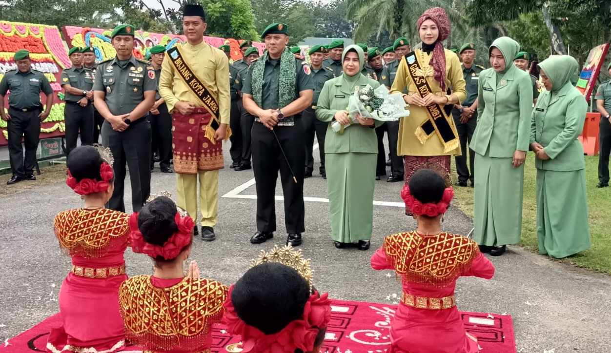 Tradisi penyambutan adat Jambi berupa tarian sekapur sirih dan pedang Pora serta pengalungan syal kepada Dandim 0415/Jambi yang baru beserta Istri