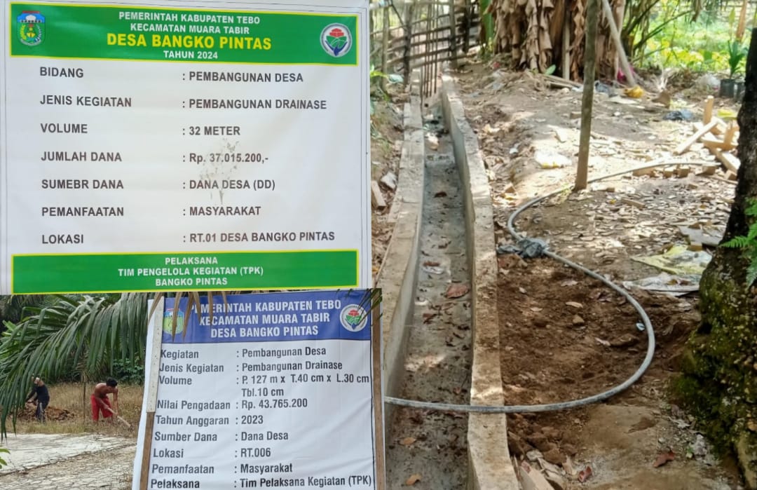 Deteksijambi.com ~ MUARA TABIR – Pembangunan drainase desa di RT 01 Desa Bangko Pintas, Kecamatan Muara Tabir, Kabupaten Tebo, menuai kritik dan menjadi tanda tanya. Pasalnya, nominal anggaran untuk pembangunan tersebut mencapai Rp. 37.015.200 dari Anggaran Dana Desa (ADD) tahun 2024.