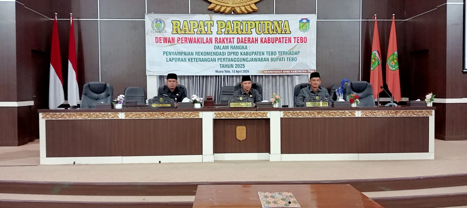 Deteksijambi.com, ~ TEBO – DPRD Kabupaten Tebo menggelar Rapat Paripurna dalam rangka penyampaian rekomendasi DPRD terhadap Laporan Keterangan Pertanggungjawaban (LKPJ) Bupati Tebo Tahun Anggaran 2025.