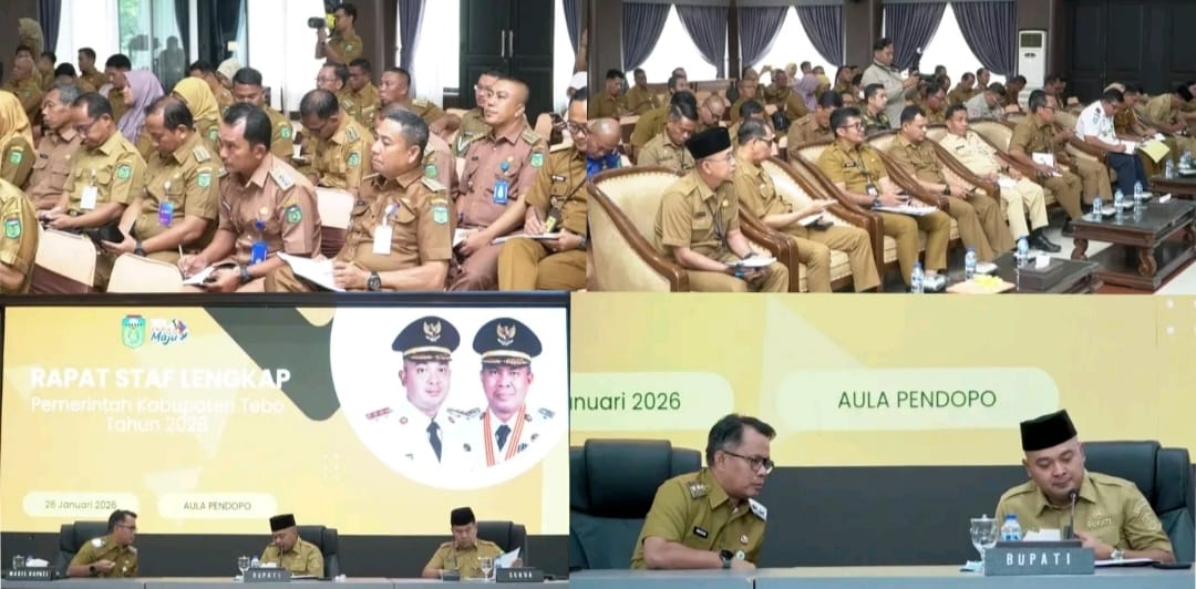 Deteksijambi.com ~ TEBO – Pemerintah Kabupaten Tebo mengadakan Rapat Staf Lengkap yang dipimpin oleh Bupati Tebo, Agus Rubiyanto, di Pendopo Rumah Dinas Bupati Tebo, pada 26 Januari 2026. Rapat ini dihadiri oleh jajaran pimpinan perangkat daerah dan bertujuan untuk membahas evaluasi kinerja, koordinasi program dan kegiatan, serta penegasan arahan pimpinan.