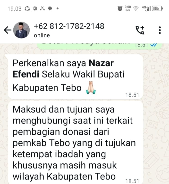Deteksijambi.com ~ TEBO, – Masyarakat Kabupaten Tebo perlu mewaspadai penipuan yang mengatasnamakan Wakil Bupati Tebo. Penipuan ini dilakukan dengan modus ingin menyalurkan bantuan donasi ke setiap masjid di Kabupaten Tebo melalui pesan WhatsApp. Pelaku penipuan meminta foto buku tabungan masjid dan nomor rekening masjid dengan dalih penyaluran donasi.